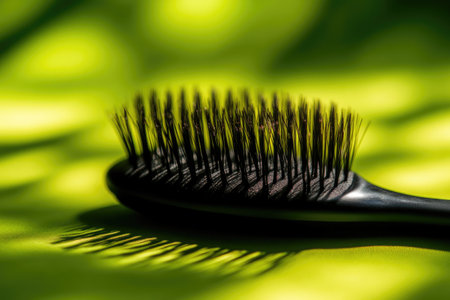 Close-Up of Hair Brush with Detailed Bristles Against Green Background