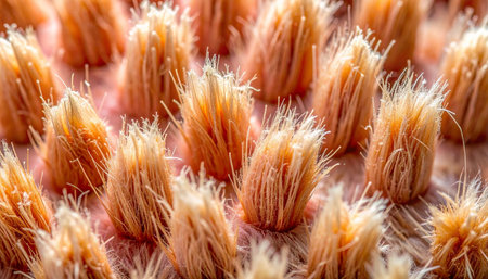 A detailed view showcasing the texture and arrangement of bristles on a soft brush highlighting their fine structure in clear light.