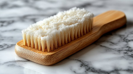 A bamboo toothbrush is placed on a polished marble countertop, showing its eco-friendly design. The bristles are clean and ready, emphasizing a sustainable choice for oral hygiene.