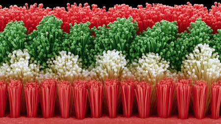 A stunning microscopic visual of colorful hair-like structures in a biological setting, showcasing intricate patterns of green, white, and red. Perfect for science and biology themes.
