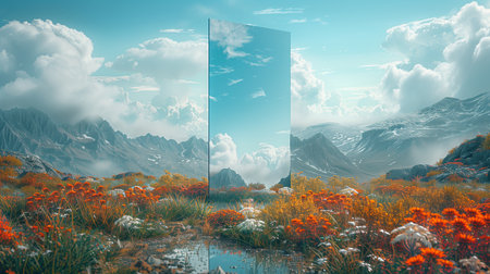Surreal landscape with mirror reflecting water in a desert. Modern surrealism and contemporary art concept. Nature and environmental protection idea. Copy space.
