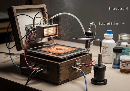 A vibrant circuit board is illuminated by colorful lights in a state-of-the-art electronics lab showcasing technology.
