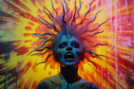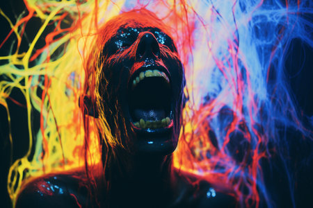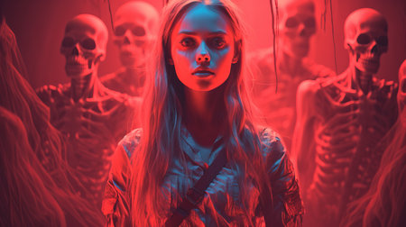 a woman with a demonic makeover on her face, captured in a close-up intensity. this haunting image, reminiscent of jasper francis cropsey's style, showcases dark white and light red tones. the photo, taken with a nikon d750, exudes an eerie atmosphere, resembling smartphone footage. ai generated