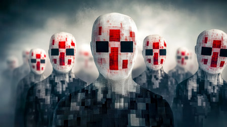 An AI generated illustration of a group of creepy figures in coats in grayscale