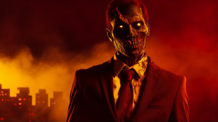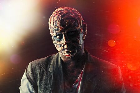 Portrait of a scary zombie man in a red smoke. Halloween.