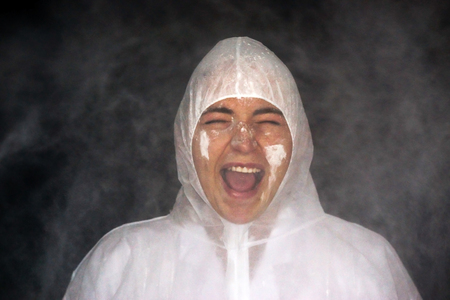 A man in a protective suit and white mask in a dark room. Halloween image concept. Virus protection. Illuminated with colored lights
