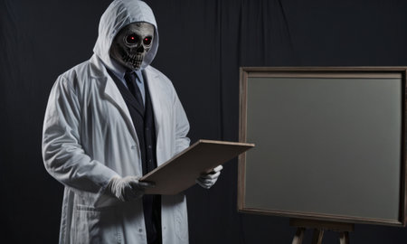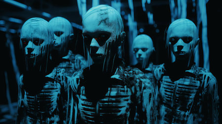Sinister hooded figure with stitched white skull mask leading eerie masked group in dark room with ominous shadowy atmosphere.
