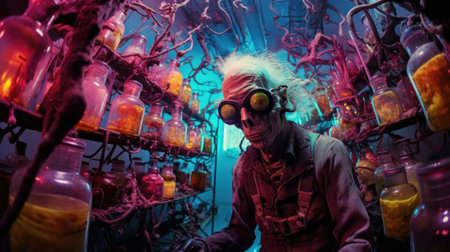 A portrait of a sick scientist after a failed experiment in the green light. Desperation, hopelessness. Horror, halloween.