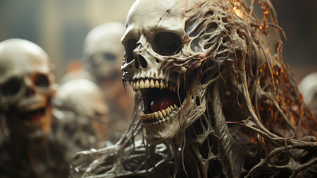a group of creepy skeletons, with their mouths open, are depicted in this hyper-realistic sci-fi image created using unreal engine 5. the skeletons are intricately designed with mechanized forms made of vines, showcasing a realistic hyper-detail. the image also showcases detailed crowd scenes, adding to the overall immersive experience. ai generated