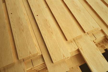 Large stack of wood planks. Upper view.