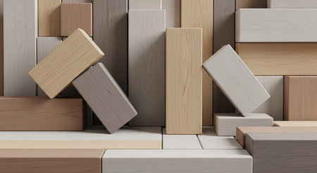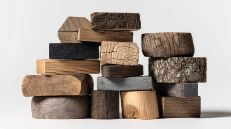 An assortment of wooden blocks, each showcasing unique textures and grains, are stacked in a composition. The blocks vary in shape and color, ranging from light to dark tones. The setting appears to be a studio environment with a bright, neutral backdrop, ideal for design, educational material, or conceptual projects.