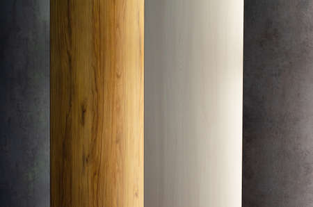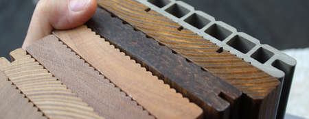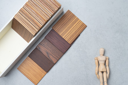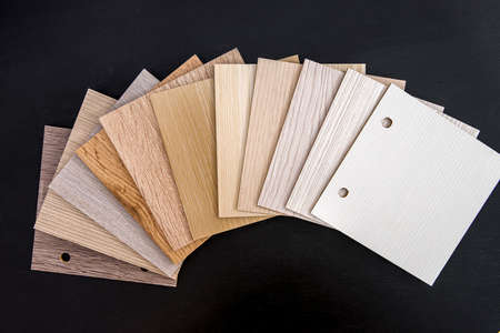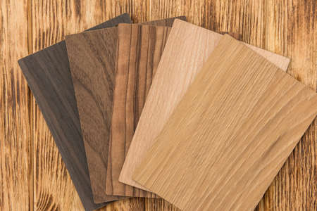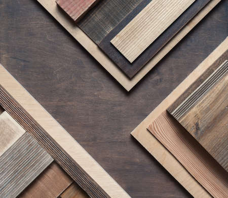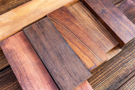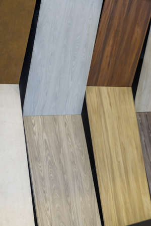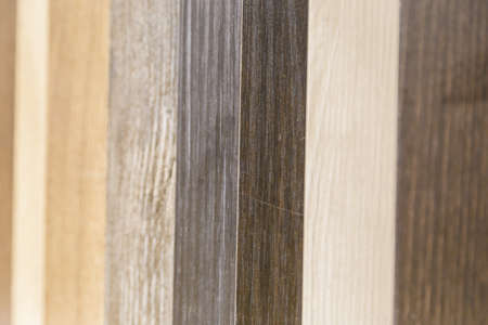 Close up of laminated, veneer, engineering wood flooring samples. Wood texture for furniture and flooring furnishing material samples. interior material design samples.