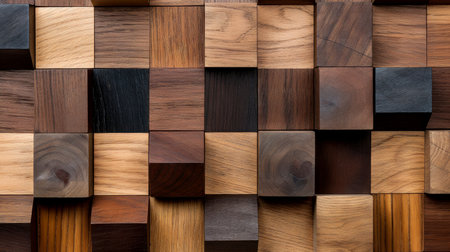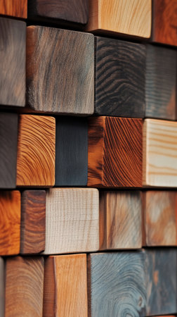 A captivating arrangement of wooden blocks showcasing a variety of textures and colors against a dark backdrop, perfect for design inspiration and creative projects.