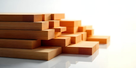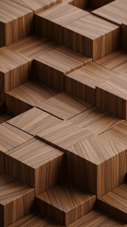 A detailed close-up of stacked wooden blocks forming a geometric pattern with visible wood grain and warm brown hues, creating a textured surface.