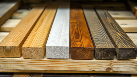 An assortment of wooden planks arranged side by side showcases varied textures and grain patterns. The collection highlights natural colors ranging from light beige to deep brown and gray tones. This visual representation can be used for design, decoration, or educational purposes. The composition is suitable for commercial and editorial applications.