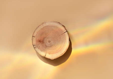 Woodcut lying on a trendy beige background. A wooden platform for luxury and natural cosmetics or products presentation. Wooden tray mockup in the sunlight. Top view
