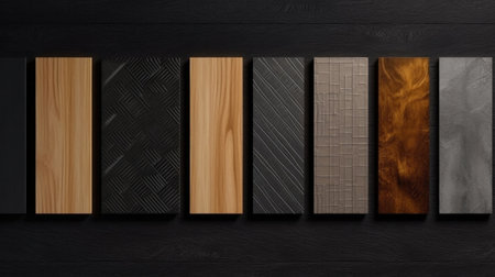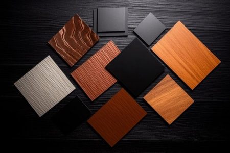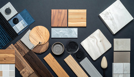 Close-up of various interior design material samples, including fabric, wood, and stone, arranged on a dark table, showing different textures and colors. High quality photo