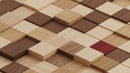 A 3D rendered isometric view of a textured surface made of light and dark wood cubes with varied heights, featuring a single contrasting red cube.
