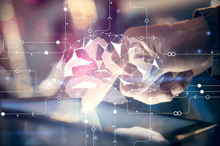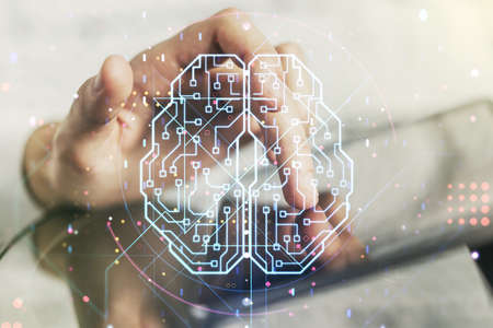 Double exposure of man's hand holding and using a digital device and brain hologram drawing. Data concept.