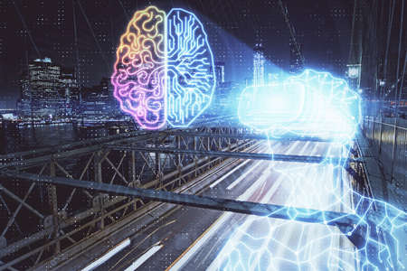 Brain hologram drawing on city scape background Double exposure. Brainstorming concept.