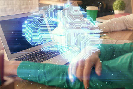 Double exposure of woman hands working on computer and brain hologram drawing. Ai concept.