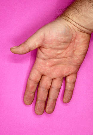 Painful rash, red spots blisters on the hand. Close up Allergy rash, human hands with dermatitis and Health problem. Ill eczema skin of patient. Viral Diseases. Red rashes on the palm. Enterovirus