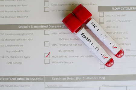 Young girl holding a test tube with blood sample for coronavirus or 2019-nCoV analyzing.