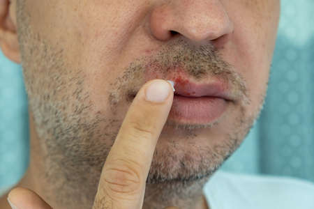 male unshaven mouth with short hair and dried herpes wound or ulcer covered with crisp near lips, closeup