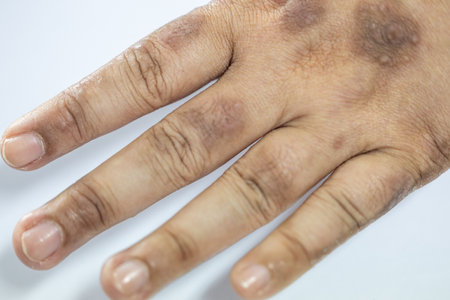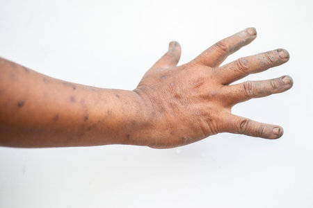 The image prominently displays a human hand exhibiting clear signs and symptoms of a monkeypox infection, which is characterized by raised lesions that are visibly noticeable on the skin surface