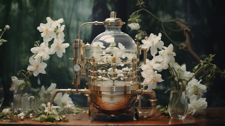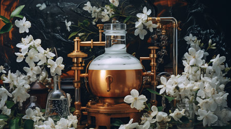 Generative AI, Essential oil extraction with distillery machine with jasmine white flowers