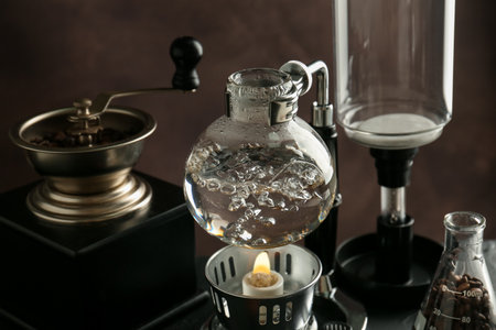Siphon (vacuum) coffeemaker with hot water and coffee grinder on black table against brown background, closeup