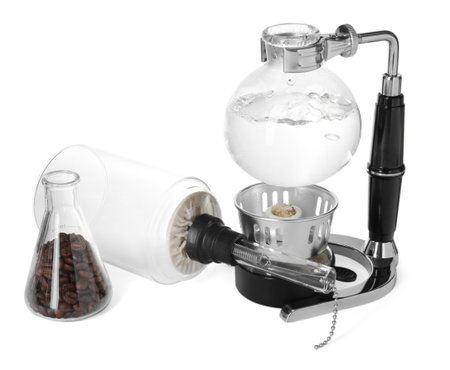 Glassware with coffee beans and siphon (vacuum) coffeemaker isolated on white