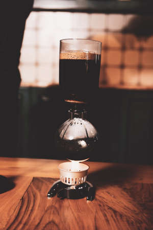 Syphon coffee close-up device with fire heats glass flask in cafe. Alternative coffee brewing method. Creative idea for advert in cafe. Professional device for coffee.