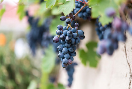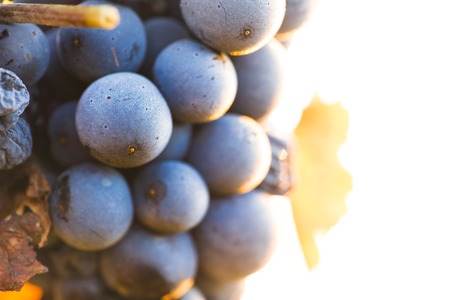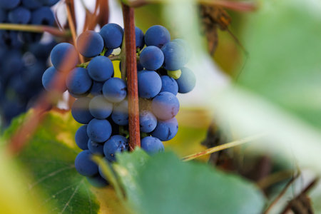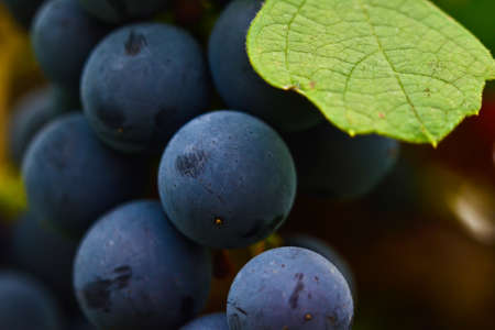 Blue wine grapes. Grapes for making wine. Detailed view of Cabernet Franc blue grape vines in the hungarian vineyard in autumn, Hungary