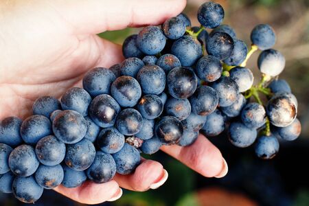 Closeup of a hand with blue ripe grapes. Fresh blue bunches of grapes. The concept of winemaking, wine, vegetable garden, cottage, harvest