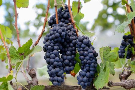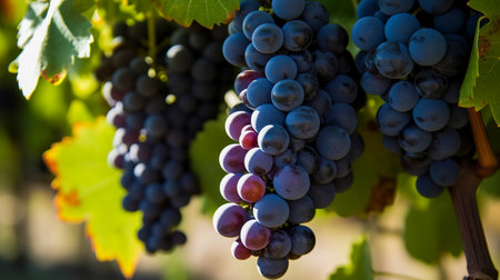 Ripe, dark skinned wine grapes hang heavy on the vine, ready for harvest, in a close up view that captures the essence of vineyard life