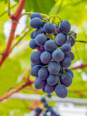 Grapevine close-up. Ripe red grapes hang in a cluster on a green vine in the vineyard. Black maiden grapes, large bunch. Delicious and healthy fruits, fresh autumn harvest.