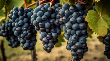 Closeup of blue grape in vineyard with sunlight. Winery and grapevine growing background frame. Generative AI