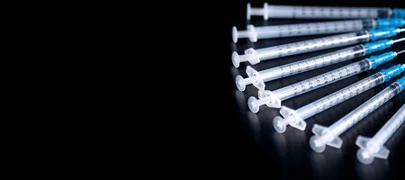 Medical Syringes Needle on Black Background, Close up Syringe, Health care concept
