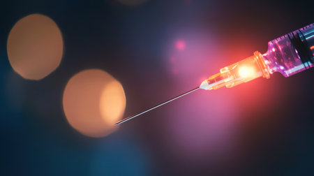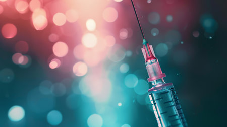 Close-up of a syringe with colorful light effects in the background. Concept of vaccination, healthcare, and medical research.