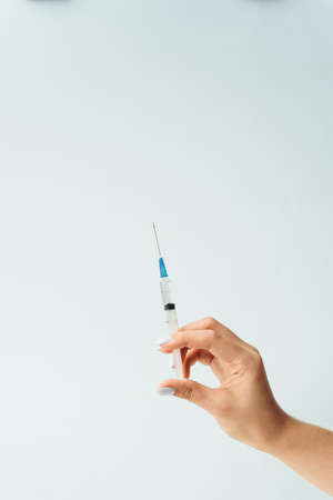 Doctors hand holds a medical syringe on a blue background. The concept of medicine and medical care for the patient.