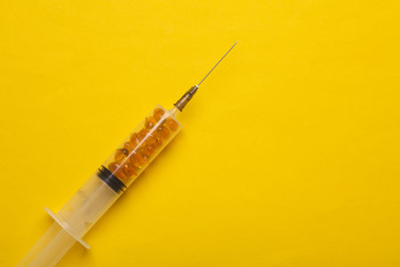 The syringe is filled with fish oil capsules on yellow background. Healthcare and medicine concept