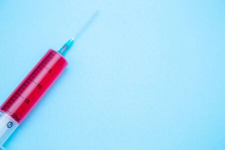 on a blue background lies a large syringe with a red medicine inside. concept. quarantine
