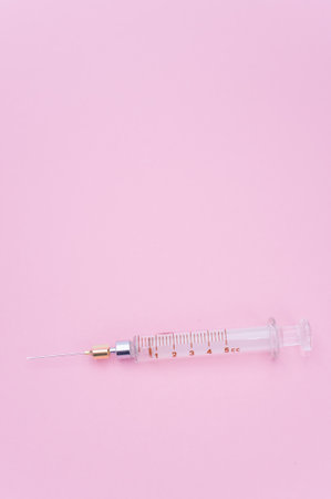 an isolated injection syringe on mauve paper background with text space
