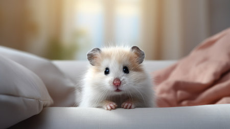 A pet hamster pauses outside its wheel in a domestic setting, with soft fur and alert eyes accentuated by warm ambient lighting and soft shadows. AI Generation. AI Generation