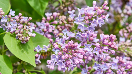 beautiful springtime colorful twig of a lilac bush with flowers and leaves