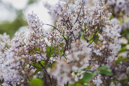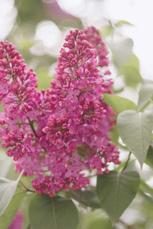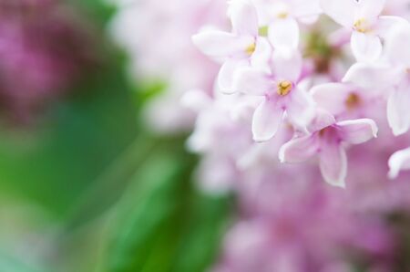 Lilac flowers. Beautiful spring background of flowering lilac. Selective soft focus, shallow depth of field. Blurred image, spring background. Purple, lilac and white.