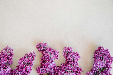 Lilac flowers on pink paper. Floral greeting card with space for text. Purple lilac border top view, stylish beautiful spring image. Happy mothers day and Womens day concept.