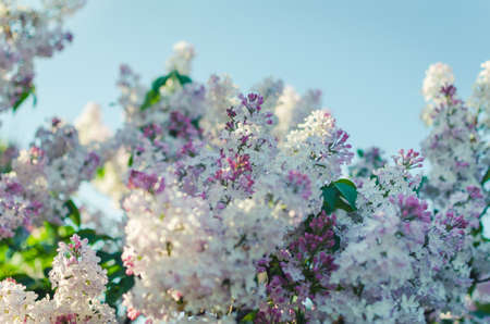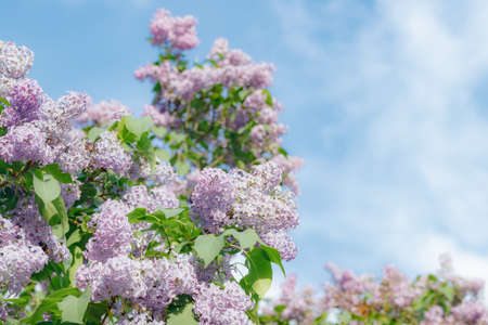 Close up. Branches of a lilac bush against the background of the May sky. Blooming lilac. High resolution wallpaper.