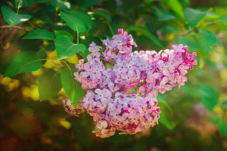 beautiful purple lilac among the green leaves on the bush in the spring garden